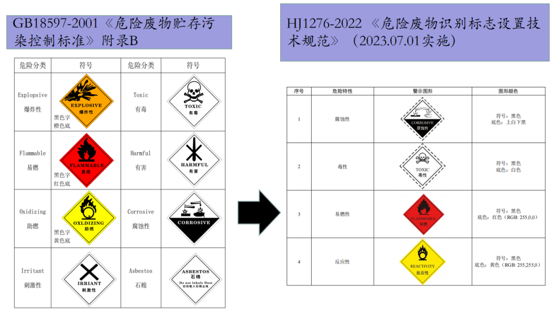 ÒÔÉÏÈý¸ö±êÇ©£¬Í¼1´ú±íΣÏÕ·ÏÎï´¢´æÀûÓô¦Öó¡Ëùʶ±ð±êÇ©£¬³ö×ÔGB15562.2Ð޸ĵ¥ºÍHJ1276£¬²ÉÓÃÈý½ÇÐκڵÄÔ²Èó´Ö¿ò£»Í¼2±êÇ©´ú±íΣÏÕ»õÎï°ü×°±êÇ©£¬³ö×ÔGB190£¬±íʾ»õÎï¾ßÓÐΣº¦Ë®Éú»·¾³ÌØÐÔ£¬ËüÇø±ðÓÚÆäËüΣÏÕ»õÎïÔËÊä±êÇ©ÊÇÏÂÃæÃ»ÓÐÎÄ×Ö£¬ÁâÐκڿò£»Í¼3ÊÇ»¯Ñ§Æ··ÖÀࣨΣº¦ÌØÐÔʶ±ð£©±êÇ©£¬³ö×ÔGB30000.28£¬±íʾ¸Ã»¯Ñ§Æ·¾ßÓÐΣº¦Ë®Éú»·¾³ÌØÐÔ£¬ÁâÐκì¿ò¡£ ¶þ¡¢Î£ÏÕ·ÏÎïΣº¦ÌØÐÔ±êÇ©ÐÞ¶©ºóµÄ¡¶Î£ÏÕ·ÏÎï´¢´æÎÛȾ¿ØÖƱê×¼¡·£¨GB18597-2023£©£¬½«2001°æµÄ¸½Â¼AÖС°Î£ÏÕ·ÏÎïÖÖÀà±êÖ¾¡±£¨ÆäʵÊÇΣº¦ÌØÐÔ±êÇ©£¬¹²8Àࣩ¸ÄΪÁË4À࣬ɾ³ýÁË¡°±¬Õ¨¡±¡¢¡°Óк¦¡±¡¢¡°´Ì¼¤¡±ºÍ¡°Ê¯ÃÞ¡±Ëĸö±êÇ©£¬½«¾É±ê×¼ÖеıêÇ©¡°Öúȼ¡±¸Ä³ÉÁË¡°·´Ó¦ÐÔ¡±£¬¡°Óж¾¡±¸ÄΪ¡°¶¾ÐÔ¡±£¬²¢ÒƵ½ÁË¡¶Î£ÏÕ·ÏÎïʶ±ð±êÖ¾ÉèÖü¼Êõ¹æ·¶¡·£¨HJ1276-2022£©¸½Â¼AÖС£±ä»¯Çé¿öÈçÏÂͼBËùʾ¡£
